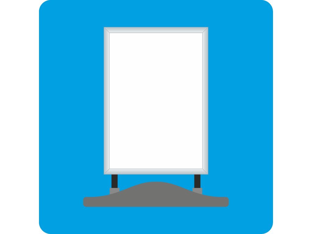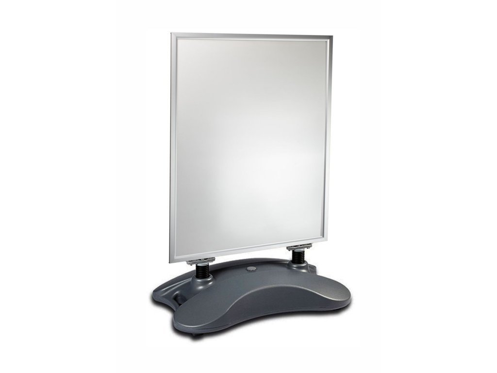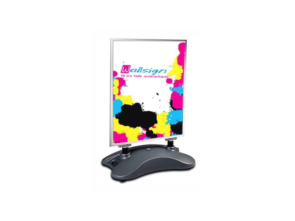 Hliníkový stojan s oboustrannou plochou pro vyvěšení plakátu formátu A1, ohebnými pružinami a plastovým zásobníkem na vodu pro kvalitní zatížení. Výměna vkladu je rychlá pomocí zaklapávacího rámu s ostrými rohy. Vklad je krytý matnou antireflexní fólií. Stojan je vhodný díky zátěži taktéž do exteriéru a masivní pružiny zaručují ohebnost při větrných podmínkách.Doplňkové parametry