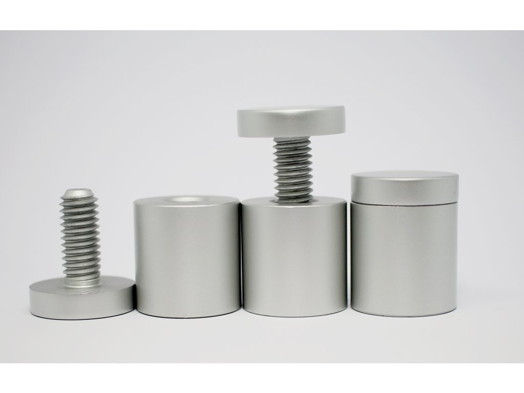 Estetický šroub s distančním sloupkem ve stříbrné barvě z eloxovaného hliníku určený pro připevnění tabulí jak v interiéru tak exteriéru.Doplňkové parametry
