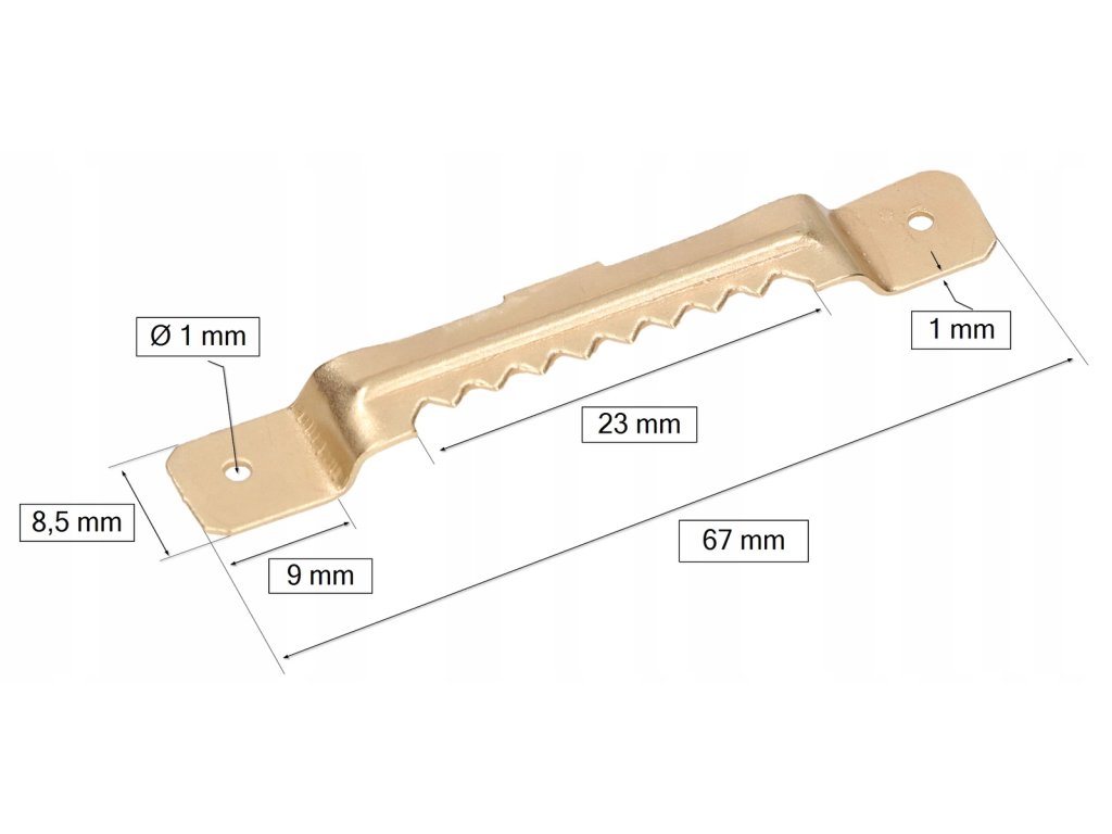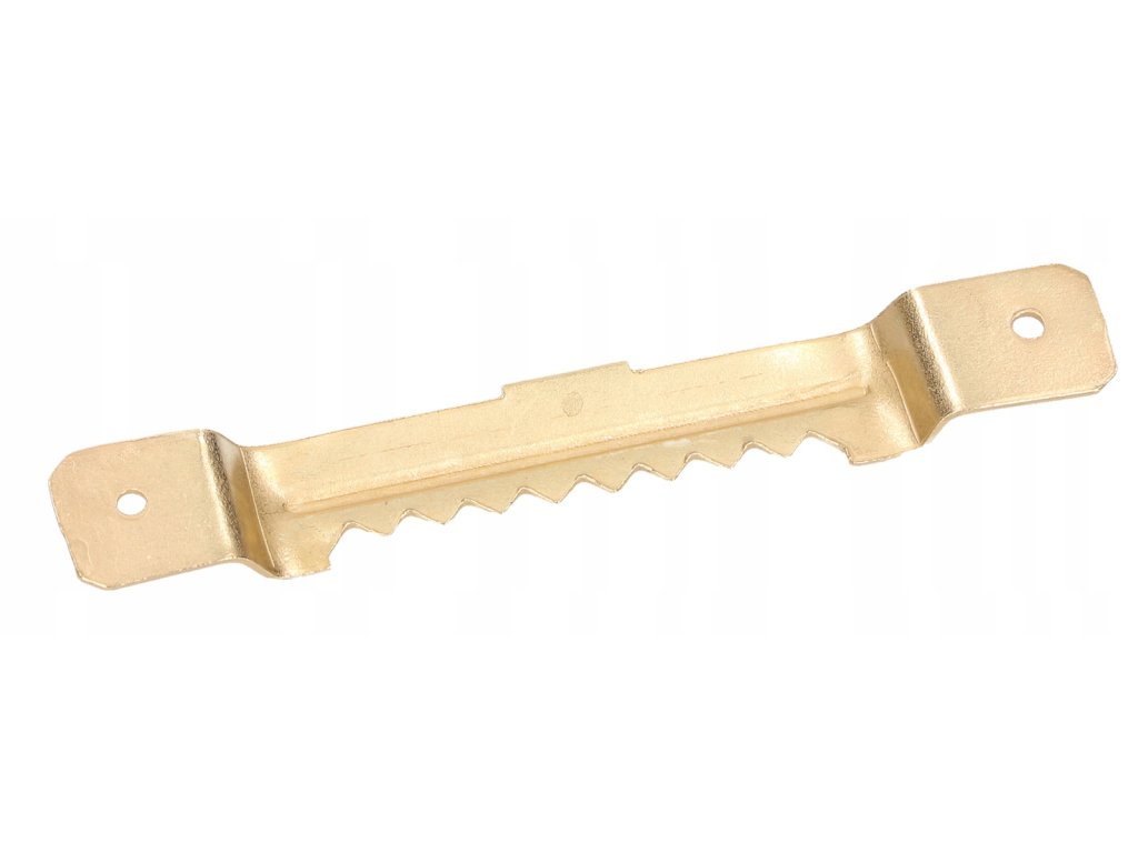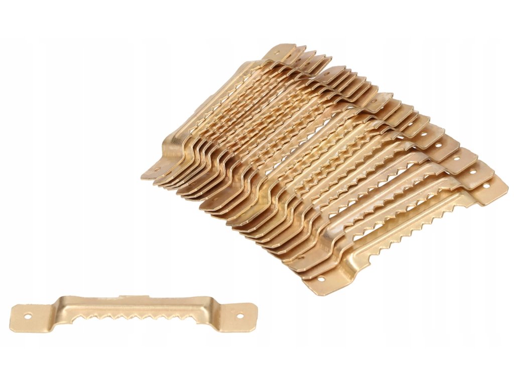 Vroubkovaný závěs můžete zatlačit nebo zatlouct. Můžete jej instalovat do materiálů, jako je masivní dřevo, MDF, překližka, dřevotříska nebo měkký plast. Přívěsek je vyroben z kalené oceli, která byla postupně potažena zinkem a mosaznou barvou. Jeho tloušťka je 1 mm, což zabraňuje praskání a ohýbání. Umožňuje zavěsit rámy obrazů, malby, zrcadla, protirámy, ozdoby na vánoční stromek nebo jiné drobné předměty.Doplňkové parametry